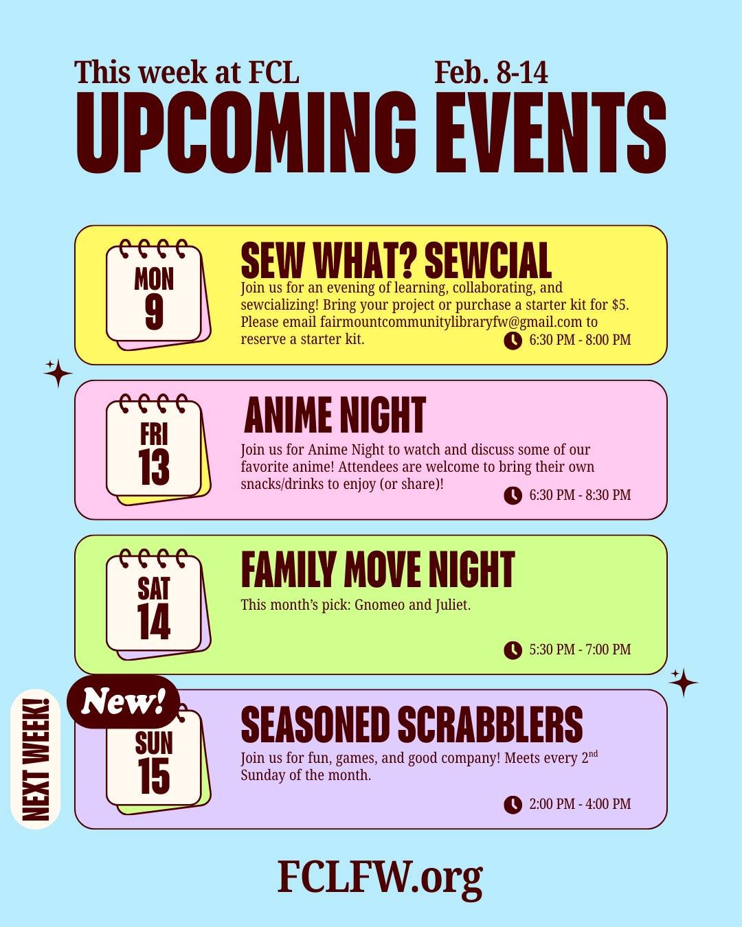 Join us for story time, game nights and other fun events throughout the year.